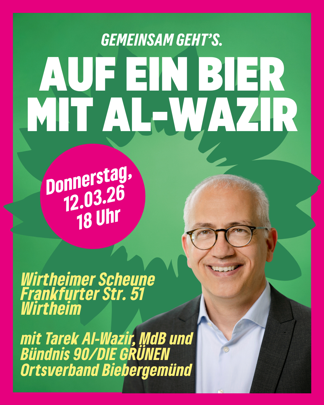 Der Ortsverband von BÜNDNIS 90/DIE GRÜNEN Biebergemünd lädt alle Bürgerinnen und Bürger herzlich ein zu „Auf ein Bier mit Al-Wazir“ am Donnerstag, den 12. März 2026, ab 18:00 Uhr in der Wirtheimer Scheune.